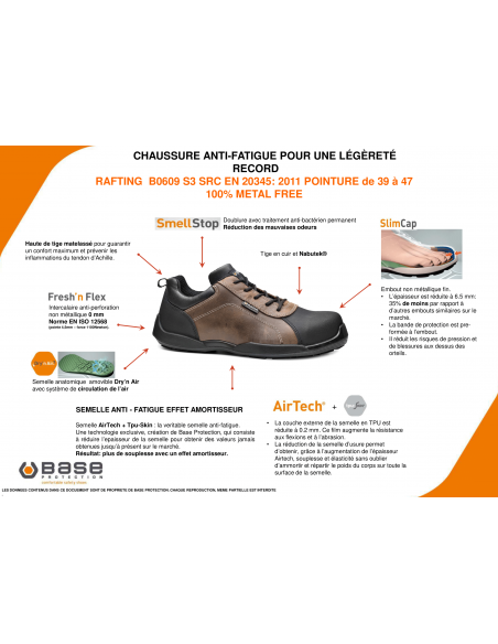 Chaussures basses de sécurité Rafting. Tige en cuir pleine fleur hydrofuge . Coque en composite avec renfort extérieur anti rayure. Bande de protection SlimCap sur coque pour éviter le cisaillement des orteils. Semelle anti perforation souple. Doublure intérieure avec traitement anti bactérien. Semelle respirante et anatomique. Résiste au glissement et aux hydrocarbures.