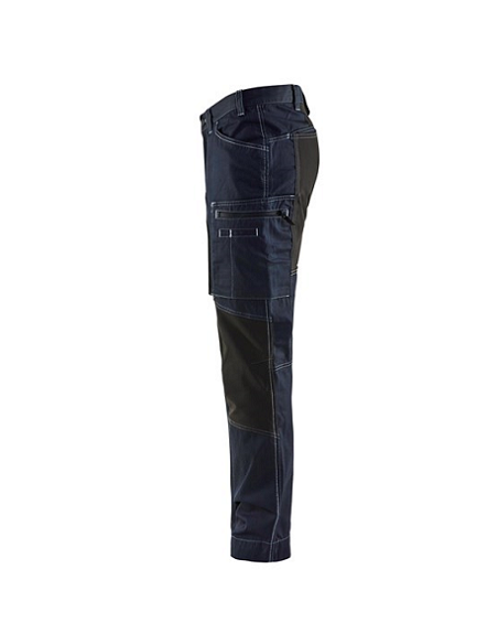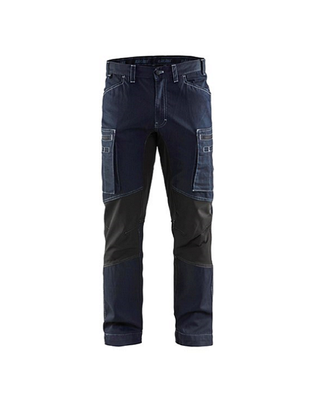 Pantalon de service denim et stretch, 85% coton, 15% polyamide, denim enduit, Cordura® 340g/m². Pour un confort optimal ce jeans a des emplacements en stretch à l'arrière, l'entrejambes et aux genoux. Braguette et bouton plastiques, anneau en D à la taille. 2 Poches arrières. 2 Poches jambes à soufflet avec zip l'une avec compartiment à stylo l'autre avec des compartiments pour couteau et règle. 2 Poches cavalières. Ourlet à découdre pour une extension de jambe 5 cm. 2 Longueurs de jambes : standards et courtes.