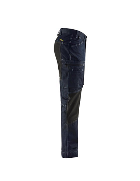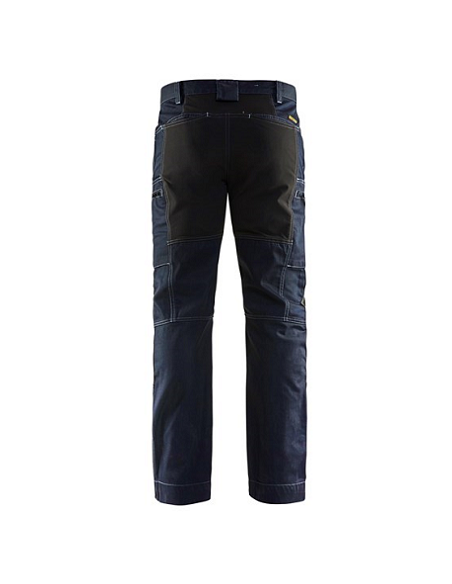 Pantalon de service denim et stretch, 85% coton, 15% polyamide, denim enduit, Cordura® 340g/m². Pour un confort optimal ce jeans a des emplacements en stretch à l'arrière, l'entrejambes et aux genoux. Braguette et bouton plastiques, anneau en D à la taille. 2 Poches arrières. 2 Poches jambes à soufflet avec zip l'une avec compartiment à stylo l'autre avec des compartiments pour couteau et règle. 2 Poches cavalières. Ourlet à découdre pour une extension de jambe 5 cm. 2 Longueurs de jambes : standards et courtes.