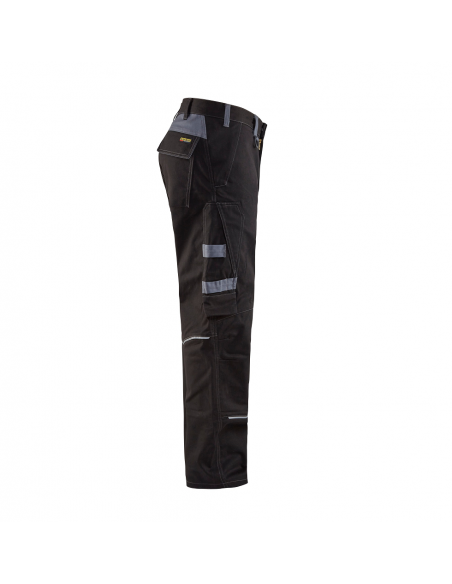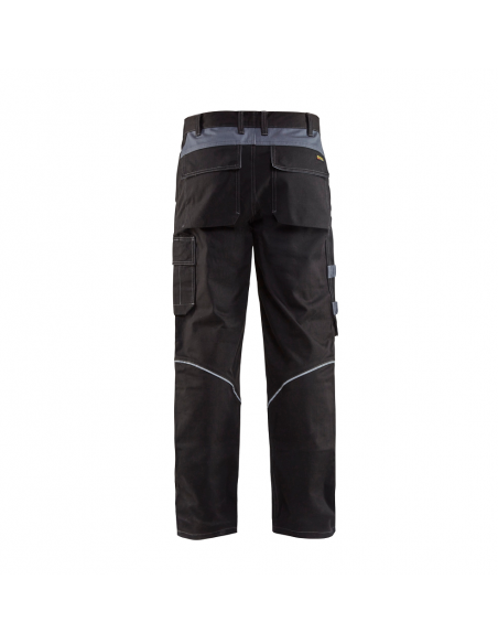 Pantalon de travail multinorme Blaklader 85% coton 14 % polyester 1 % antistatique 350 gr /m². Idéal pour la soudure, il protège des petites projections de métal en fusion et des arcs électriques. Retardant flamme. Lavable industriellement. Couture renforcée. Coupe ajustée, genoux pré-pliés. Détails réfléchissants. Braguette et bouton métal. Dos rehaussé. 2 Poches avant avec rabat, 2 Poches arrières avec rabat, 1 Poche jambe à soufflet et rabat, 1 Poche mètre. 3 Longueurs de jambes : longues, standards et courtes.
