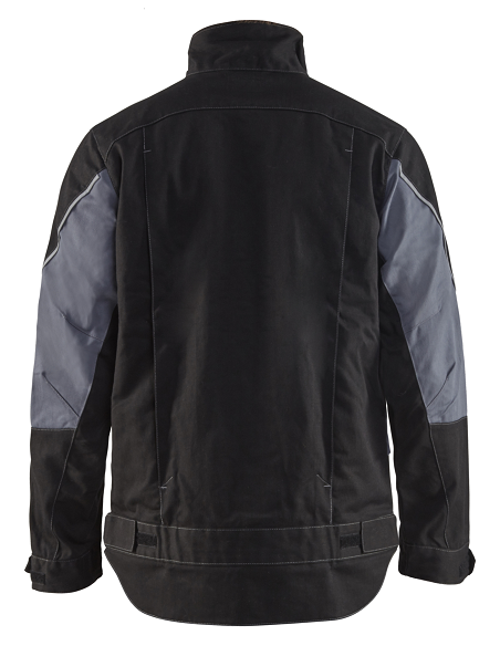 Veste de travail normée Blaklader, 85% coton 14 % polyester 1 % antistatique 350 gr /m². Idéale pour la soudure, elle protège des arcs électriques. Retardant flamme. Lavable industriellement. Col montant. Fermeture centrale zip métal YKK et rabat. 2 Poches poitrine à zip et rabat, 2 Poches mains à rabat, 1 Poche intérieure avec compartiment téléphone. Détails réfléchissants. Taille et poignets réglables par velcro. Réhausse le dos.