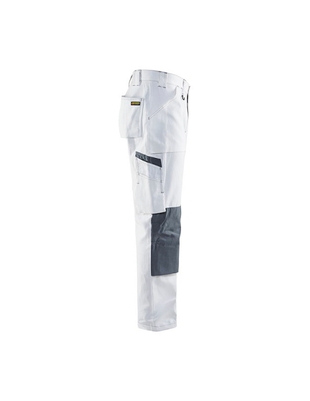 Pantalon blanc de peintre Blaklader, 100% coton croisé 320 gr /m2. Poches genouillères renforcées en Cordura®. Triple coutures à l'entrejambes pour plus de robustesse. Dos réhaussé et larges passants pour plus de confort. Braguette plastique, boutons métal - Boucle porte-marteau, anneau en D à l'avant. 2 Poches arrières à soufflet renforcés cordura, 2 Poches avant à soufflet, 1 Poche jambe avec fermeture à bouton, Poche stylos et téléphone, 1 Porte badge identifiant, 1 Poche mètre. 3 Longueurs de jambes : longues, standards ou courtes.
