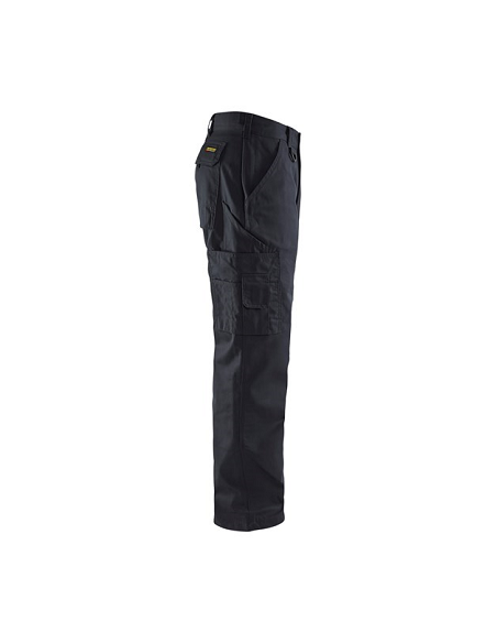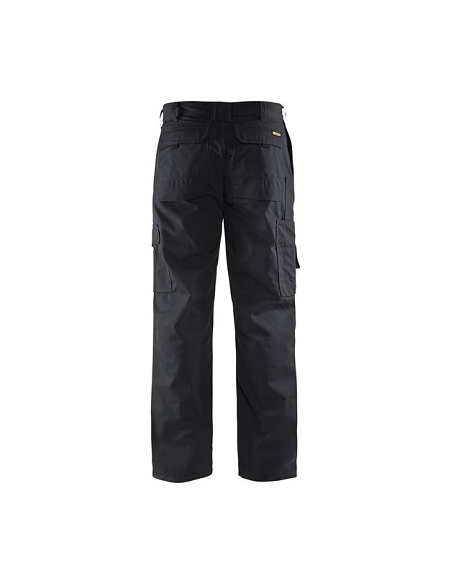 Pantalon Blaklader, 65% polyester, 35% coton croisé, 240 g/m². Indispensable et fonctionnel dans le secteur des services. Triples coutures à l'entrejambes. Braguette plastique, boutons métals. 2 Poches avant, 2 Poches arrières à rabat et velcro, 1 Poche jambe avec soufflet, 1 Poche téléphone, 1 Poche mètre. 2 Longueurs de jambes : standarts ou courtes.