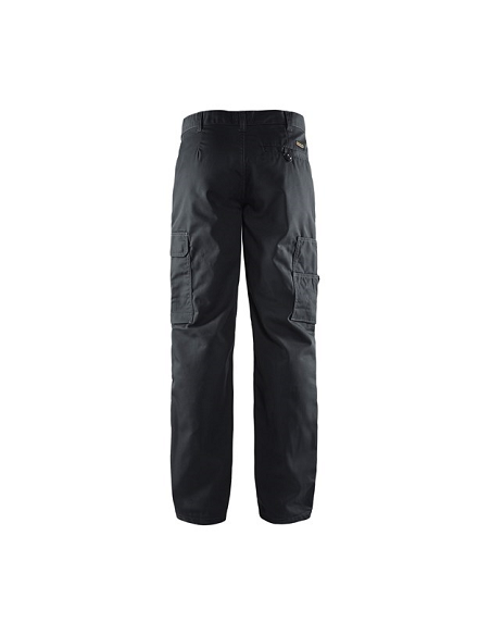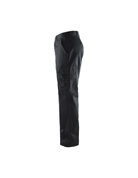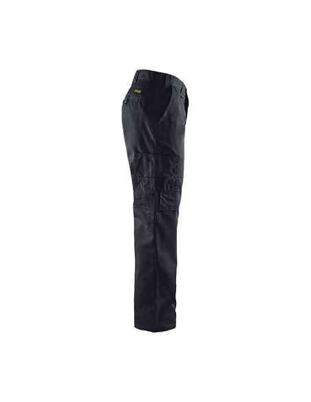 Pantalon Blaklader, 65% polyester, 35% coton croisé 240 gr/m². Léger et confortable, ce pantalon est adapté au travail en intérieur dans le secteur des services. Fermeture zippée, bouton plastique. 1 Poche arrière fermée avec bouton plastique, 2 Poches cavalières, 2 Poches latérales avec soufflet fermées par un rabat, 1 Poche stylo, 1 poche téléphone. 3 longueurs de jambes.