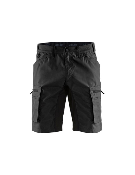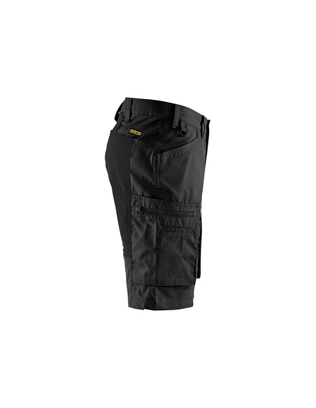 Short de service Blaklader, 65% polyester, 35% coton 166 gr/m2. Idéal en saison estivale. Ce short léger à des emplacements en stretch à l'arrière et à l'entrejambe. Braguette et bouton plastique, anneau en D à la taille. 2 Poches arrières, 2 Poches jambes à soufflet avec zip l'une avec compartiment à stylo l'autre avec des compartiments pour couteau et règle, 2 Poches cavalières.