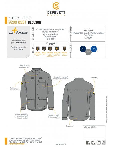 Blouson ATEX 350 Cepovett, 64% coton, 35% polyester, 1% fibre antistatique 370 gr/m². Antistatique et ignifugé, il protège de la chaleur, des flammes et des dangers thermiques d'un arc électrique. Idéal pour assurer la sécurité au travail dans les atmosphères explosives. Col montant. 2 Poches basses à rabats et boutons, 2 Poches basses double entrée à rabats et boutons, 1 Poche poitrine, 1 Poche intérieure. Fermeture centrale par pressions cachée sous rabat. Extension du dos. Soufflet arrière d'aisance.