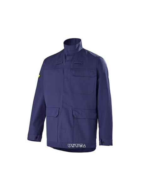 Blouson ATEX 350 Cepovett, 64% coton, 35% polyester, 1% fibre antistatique 370 gr/m². Antistatique et ignifugé, il protège de la chaleur, des flammes et des dangers thermiques d'un arc électrique. Idéal pour assurer la sécurité au travail dans les atmosphères explosives. Col montant. 2 Poches basses à rabats et boutons, 2 Poches basses double entrée à rabats et boutons, 1 Poche poitrine, 1 Poche intérieure. Fermeture centrale par pressions cachée sous rabat. Extension du dos. Soufflet arrière d'aisance.