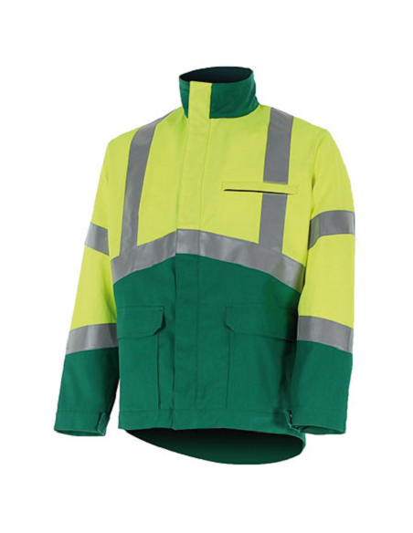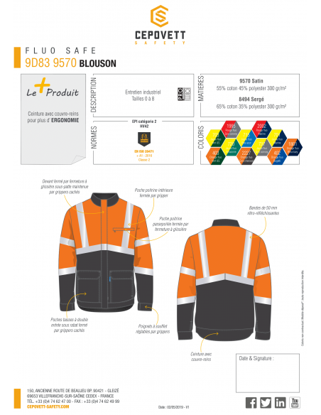 Blouson haute visibilité FLUO SAFE est confectionné avec des tissus français. Tissu fluorescent 55% coton, 45 %, polyester 300 gr/m2. Tissu contraste 65 % coton, 35 % polyester 300 gr/ m2.