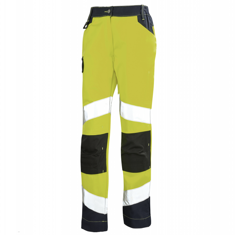 Pantalon coupe femme haute visibilité FLUO TECH. Tissu fluorescent 55% coton, 45 % polyester 300 gr/m². Tissu de contraste 65 % coton, 35 % polyester 300 gr/m².