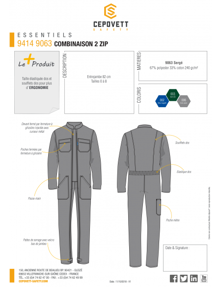 Combinaison 2 zips Cepovett, 67% polyester, 33% coton 240 gr/m². Ce modèle économique protège des salissures. Léger et facile d'entretien. 2 Fermetures zippées plastiques qui démarrent à 10 cm de l'ourlet. Col cavalier. 2 Poches poitrine zippée, 2 poches profondes sur les cotés, 1 Poche mètre.