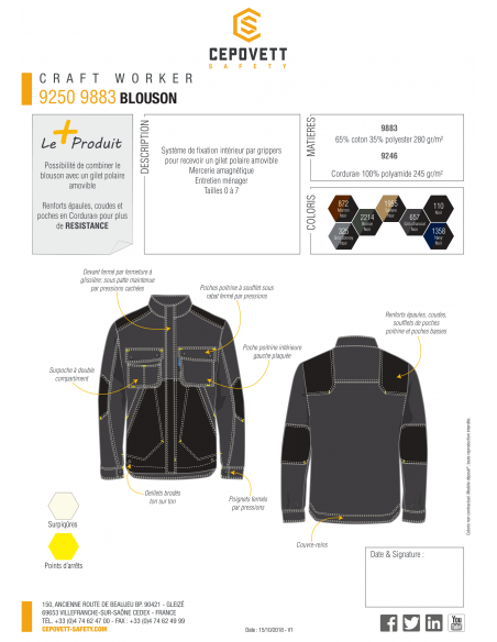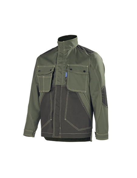 Blouson de travail CRAFT WORKER, confectionné avec des tissus français, 65 % Coton, 35% polyester 280 gr/m². Renforts en cordura pour une meilleure résistance au frottement. 2 Poches basses. 2 Poches poitrine à soufflet et fermeture bouton. 1 Poche intérieure. Fermeture centrale zippée avec rabat à pression. Poignets réglables et pression. Mercerie amagnétique. Extension du bas du dos pour plus de confort. Idéal pour les métiers du bâtiment et de l'industrie.