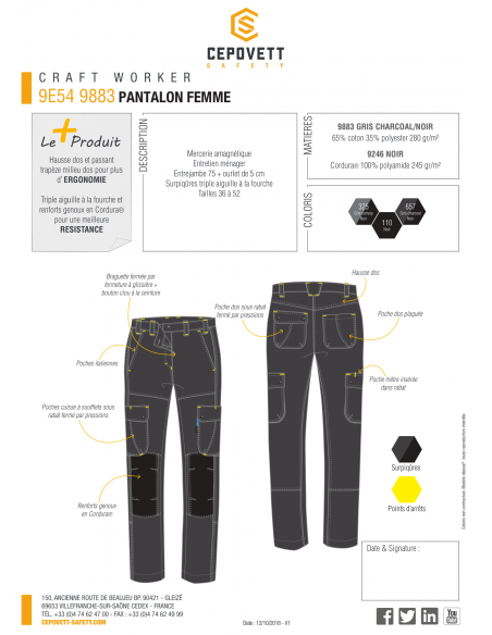 Pantalon de travail CRAFT WORKER, confectionné avec des tissus français, 65% Coton, 35% polyester 280 gr/m². Coupe femme, ce pantalon est idéal pour tous types métiers. Renforts genoux en cordura pour une meilleure résistance à l'abrasion. Taille rehaussée et semi élastiquée. Passants larges. 2 Poches cavalières et 1 sur poche, 1 Poche mètre, 2 Poches cuisse à soufflet et rabat, 1 Poche stylo, 1 Poche arrière à rabat. Triple coutures. Mercerie amagnétique. Entrejambe de 80 cm. Ourlet de 5cm pour allonger les jambes.