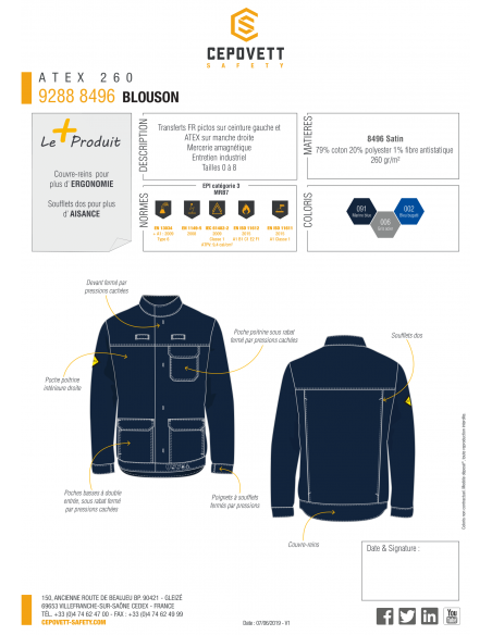 Blouson ATEX 260 Cepovett, 75% coton, 20% polyester, 1% fibre 260 gr /m². Antistatique et ignifugé, il protège de la chaleur, des flammes et des dangers thermiques d'un arc électrique. Idéal pour assurer la sécurité au travail dans les atmosphères explosives. Col montant. 2 Poches basses double entrée à rabats et boutons, 1 Poche poitrine, 1 Poche intérieure. Fermeture centrale par pressions sous rabat. Extension du bas du dos. Soufflet arrière pour plus d'aisance.