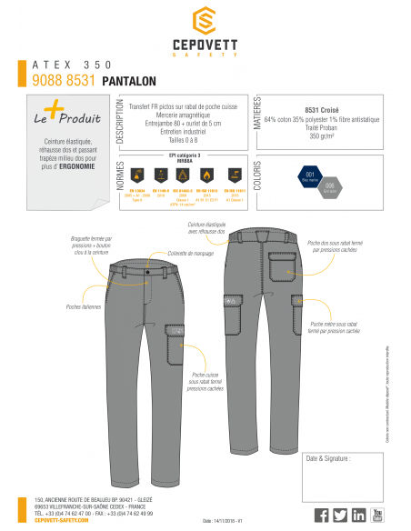 Pantalon Atex 350 Cepovett, 64% coton, 35% polyester, 1% fibre antistatique 370 gr/m². Ignifugé et antistatique, il protège des flammes, de la chaleur et des dangers d'un arc électrique. Taille semi élastiquée. Rehausse dos. 2 Poches italiennes, 1 Poche cuisse à rabat et bouton, 1 Poche mètre, 1 Poche arrière à rabat bouton. Fermeture par boutons. Entrejambes de 80 cm. Ourlet de 5 cm pour allonger les jambes.