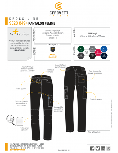 Pantalon Blanc femme KROSS LINE 65% coton, 35% polyester 300 gr/m². Classique et confortable. Poches genouillères. Taille semi élastiquée. Larges passants larges. Réhausse dos. Braguette zippée avec bouton. Mercerie amagnétique. 2 Poches cavalières, 1 Poche mètre, 1 Poche cuisse à soufflet et rabat, 1 Poche arrière. Entrejambes de 75 cm. Ourlets de 5 cm pour allonger les jambes.