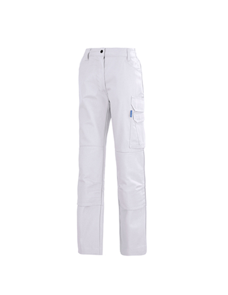 Pantalon Blanc femme KROSS LINE 65% coton, 35% polyester 300 gr/m². Classique et confortable. Poches genouillères. Taille semi élastiquée. Larges passants larges. Réhausse dos. Braguette zippée avec bouton. Mercerie amagnétique. 2 Poches cavalières, 1 Poche mètre, 1 Poche cuisse à soufflet et rabat, 1 Poche arrière. Entrejambes de 75 cm. Ourlets de 5 cm pour allonger les jambes.