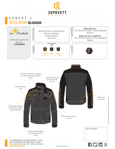 Veste KONEKT 2 Cepovett 79% coton, 20% polyester, 1% fibre antistatique 450 gr/m2. Ignifugé et antistatique, elle protège des flammes, de la chaleur et des dangers d'un arc électrique. Cette veste très épaisse est idéale pour la soudure avec projections de métal (MAG, MIG, MMA ). Col montant. Fermeture centrale zippée et boutons pressions plastiques. 2 Poches basses fermées par pression, 1 poche poitrine extérieure à rabat et bouton, 1 Poche poitrine fermée par zip. Mercerie amagnétique.