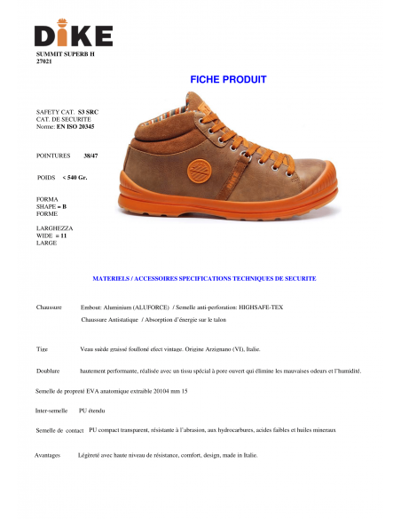 Chaussures semi montantes de sécurité Summit Superb. Tige en cuir suédé, graissé hydrofuge. Doublure intérieure en tissus technique qui élimine les mauvaises odeurs et l'humidité. Coque en aluminium. Semelle anti perforation. Résiste au glissement et aux hydrocarbures. Ce modèle léger et souple convient à de nombreux métiers de l'artisanat, des services et de l'industrie.