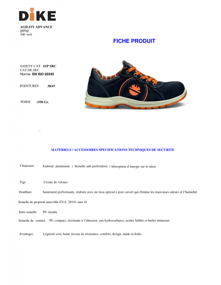 Chaussures de sécurité basses Agility Advance. Doublure intérieure en tissus technique qui élimine les mauvaises odeurs et l'humidité. Coque en aluminium. Semelle anti perforation. Résiste au glissement et aux hydrocarbures. Ce modèle léger et souple convient à de nombreux métiers de l'artisanat, des services et de l'industrie.