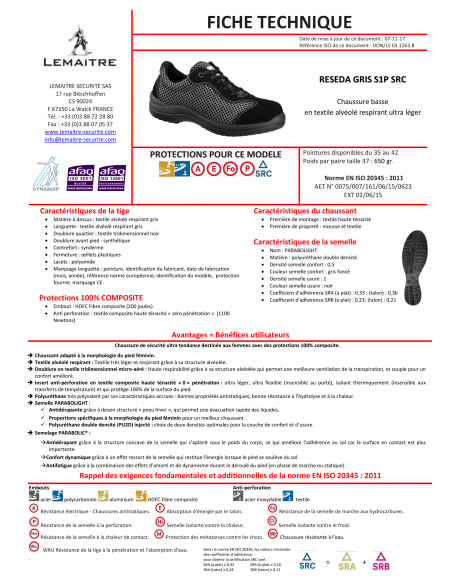 Chaussures basses de sécurité Reseda Lemaitre. Modèle femme. Tige en textile alvéolé respirant. Coque composite avec renfort extérieur. Semelle anti perforation souple. Résiste au glissement et aux hydrocarbures. Chaussures souples et confortables adaptées à la morphologie du pied féminin.