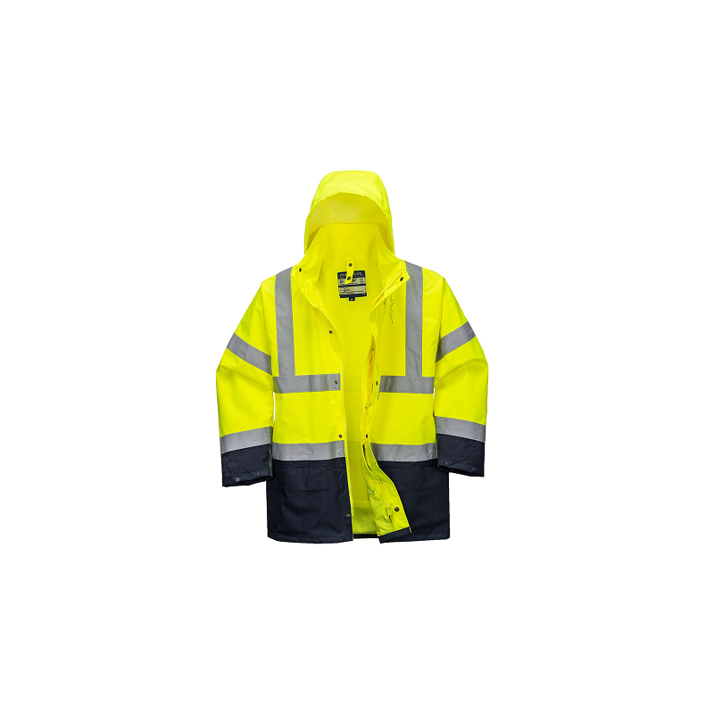 Parka haute visibilité 5 en 1, 100% polyester oxford 190 gr, traité anti tache. Doublure polaire 280 gr/m2 et tissu mesh 60 gr/m2. Fontionnelle et adaptable, elle protège du froid et peut etre portée en parka, veste de pluie, coupe vent, polaire et gilet. Col montant avec capuche rétractable. Fermeture centrale zipée à double sens. Poignets réglables avec bouton. 2 Grandes poches avant, poche télephone. Bandes réfléchissante de 5 cm.
