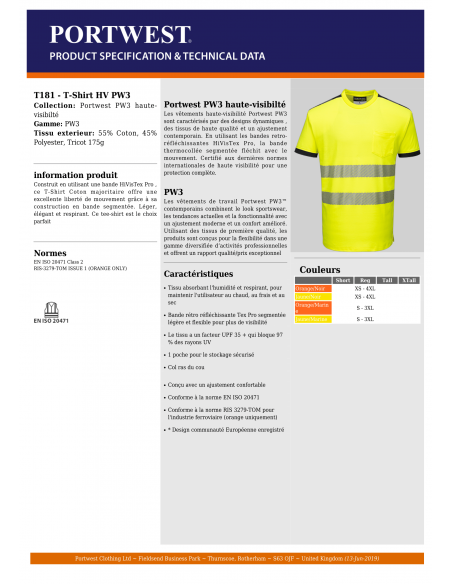 Tee-Shirt de travail haute visibilité, 55% coton, 45% polyester, qualité UPF 35 qui bloque 97% des rayons UV. Très confortable et respirant grâce au coton majoritaire, il est idéal en période estivale. Bandes réfléchissantes segmentées de 5 cm alliant confort, respirabilité et visibilité. Col rond. 1 Poche poitrine.