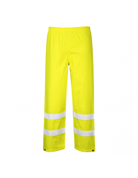 Pantalon de pluie haute visibilité, 100% polyester 190 gr. Conçu pour protéger les travailleurs du vent et de la pluie. Taille élastiquée et un ourlet ajustable avec un bouton pression. Coutures thermo soudées.