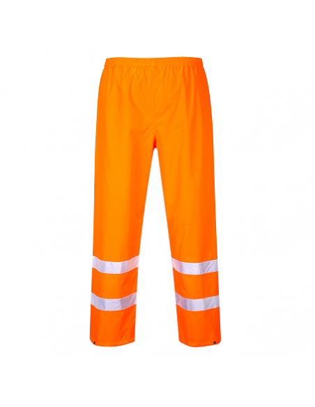 Pantalon de pluie haute visibilité, 100% polyester 190 gr. Conçu pour protéger les travailleurs du vent et de la pluie. Taille élastiquée et un ourlet ajustable avec un bouton pression. Coutures thermo soudées.