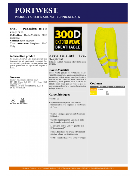 PANTALON RESPIRANT HAUTE VISIBILITÉ PORTWEST
