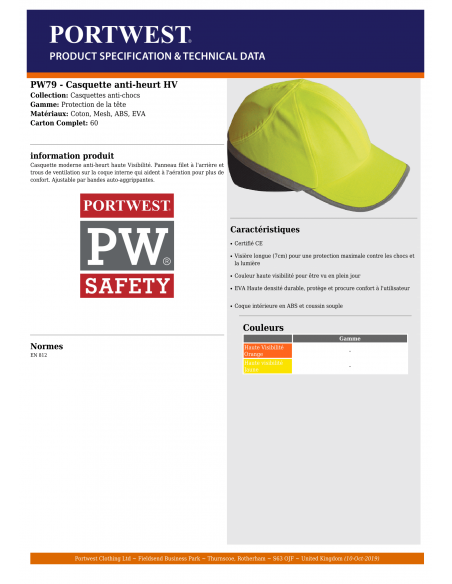 Casquette anti-heurts haute visibilité jaune ou orange pour être vu en plein jour. Visière longues 7 cm. EVA Haute densité durable. Coque intérieure en ABS et coussin souple.