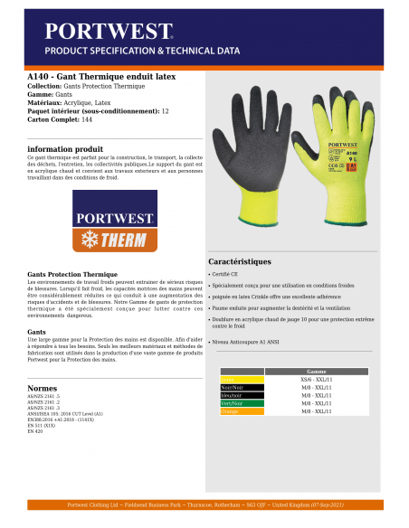 Gants de protection parfait pour la construction, le transport, la collecte des déchets, les collectivités publiques. Ces gants sont doublés en acrylique chaud de jauge 10 spécialement conçu pour une utilisation en condition froide acrylique. Enduction paume latex Crinkle pour une excellente adhérence , dos ventilé. Niveau Anti coupure A1.