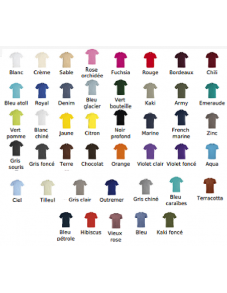 Tee-shirt manches courtes SOL'S Impérial 190 gr, 100% coton semi peigné Ringspun. Col avec bord cote élasthanne et bande de propreté.Tailles XS à 5 XL selon les coloris. 46 coloris disponibles. Existe en col V, en version manches longues et version femme.