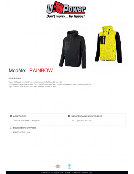 Veste Rainbow U-Power, 100% polyester 310 gr/m². Tissus extérieur en maille avec intérieur polaire. Col haut avec capuche. Fermeture centrale par zip. Taille et poignets en biais stretch. 2 Poches mains avec zip. 1 Poche poitrine avec zip.