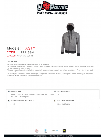 Veste sweat Tasty U-Power 67% nylon, 28% rayon, 5% spandex 330 gr/m2. Tissus confortable en jersey stretch. Col haut avec capuche. Fermeture centrale par zip. Taille et poignets en cote élastiqués. 2 Poches mains. 1 Poche poitrine avec zip.