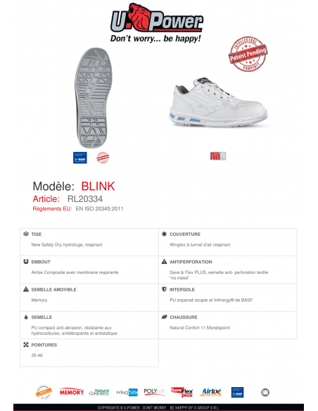 Chaussures de sécurité basses Red Lion Blink U-Power. Coloris blanc. Tige en New Safety Dry hydrofuge et respirante. Coque en composite. Semelle anti perforation souple. Système infinergy qui assure un amorti moelleux et dynamique. Ce modèle est idéal pour les positions debout prolongée, le piétinement et les déplacements à pied répétés. Résiste aux hydrocarbures et au glissement. Ce modèle convient pour l'artisanat et les métiers de bouche.