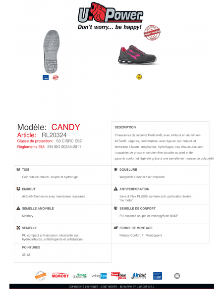 Chaussures de sécurité basses Red Lion Candy U-Power. Gamme femme. Tige en nubuck hydrofuge. La doublure Wingtex® permet l'absorption et l’évacuation de la transpiration. Coque en aluminium. Semelle anti perforation souple. Système infinergy qui assure un amorti moelleux et dynamique. Résiste aux hydrocarbures. Résiste au glissement. Ce modèle convient aux utilisateurs en position debout prolongée, aux piétinements et aux déplacements à pied répétés.