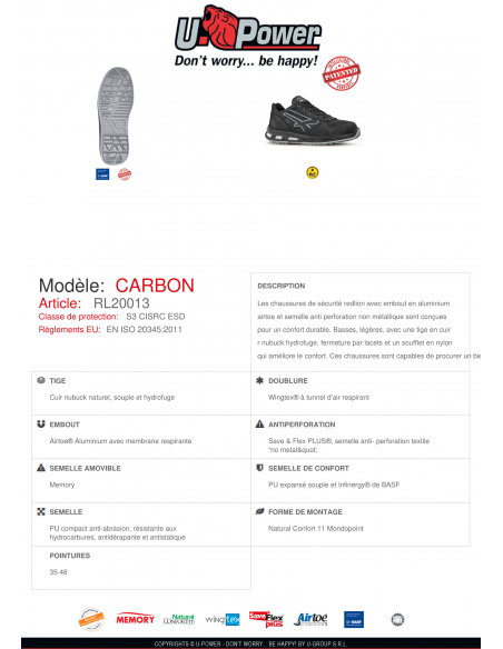 Chaussures de sécurité Red Lion Carbon U-Power. Basses et légères avec une tige en nubuck hydrofuge. La doublure Wingtex® permet l'absorption et l’évacuation de la transpiration. Coque en aluminium. Semelle anti perforation souple. Système infinergy qui assure un amorti moelleux et dynamique. Résiste aux hydrocarbures et au glissement. Protège des décharges électrostatiques. Ce modèle convient aux utilisateurs en position debout prolongée, aux piétinements et aux déplacements à pied répétés.