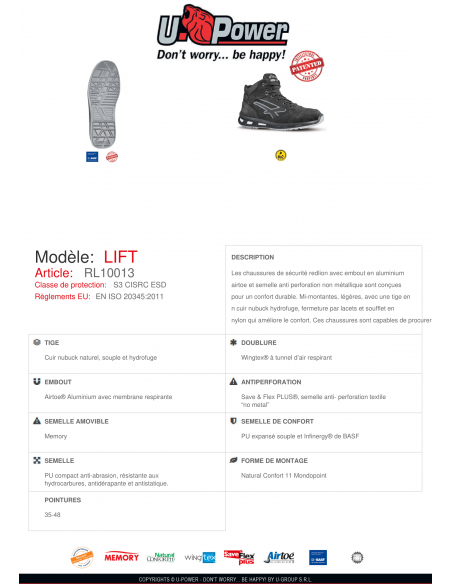 Chaussures de sécurité montantes Red Lion Lift U-Power. Légères et confortables. Tige en nubuck hydrofuge. La doublure Wingtex® permet l'absorption et l’évacuation de la transpiration. Coque en aluminium. Semelle anti perforation souple. Système infinergy qui assure un amorti moelleux et dynamique. Résiste aux hydrocarbures et au glissement. Protège des décharges électrostatiques. Ce modèle convient aux utilisateurs en position debout prolongée, aux piétinements et aux déplacements à pied répétés.