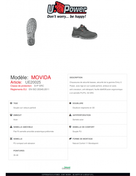 Chaussures basses de sécurité Movida U-Power. Tige en cuir velours, perforé pour plus respirabilité. Coque en acier. Semelle anti perforation. Semelle flat fit souple. Résiste au glissement et aux hydrocarbures. Ce modèle souple et confortable est idéal pour l'industrie.